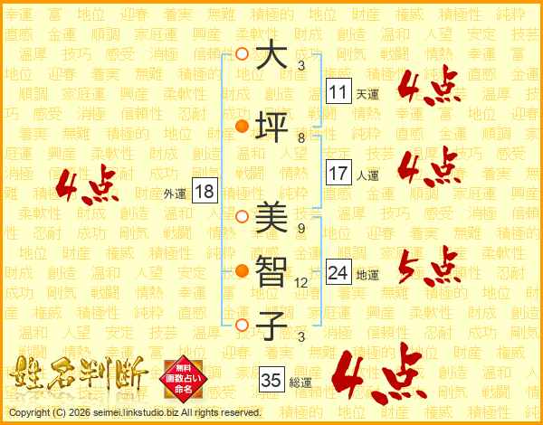 大(3画)坪(8画) 美(9画)智(12画)子(3画)