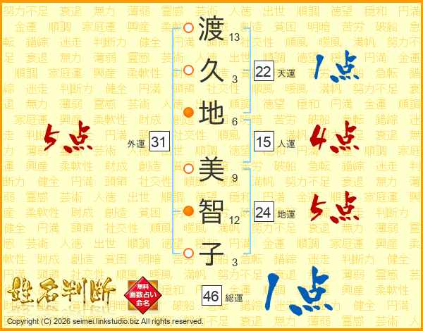 渡(13画)久(3画)地(6画) 美(9画)智(12画)子(3画)
