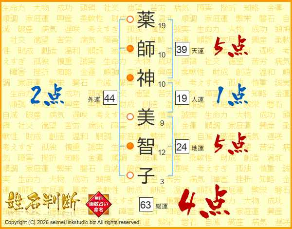 薬(19画)師(10画)神(10画) 美(9画)智(12画)子(3画)