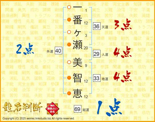 一(1画)番(12画)ヶ(3画)瀬(20画) 美(9画)智(12画)恵(12画)