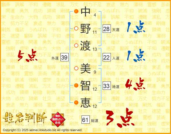 中(4画)野(11画)渡(13画) 美(9画)智(12画)恵(12画)