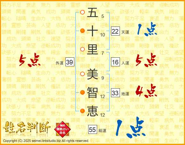 五(5画)十(10画)里(7画) 美(9画)智(12画)恵(12画)