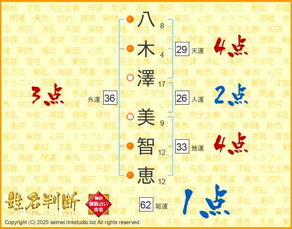 八(8画)木(4画)澤(17画) 美(9画)智(12画)恵(12画)