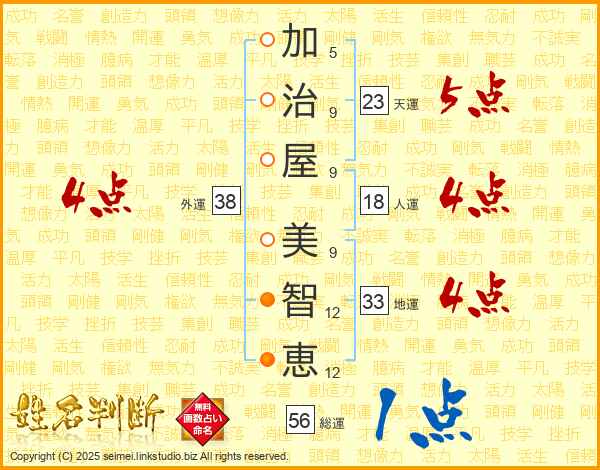 加(5画)治(9画)屋(9画) 美(9画)智(12画)恵(12画)