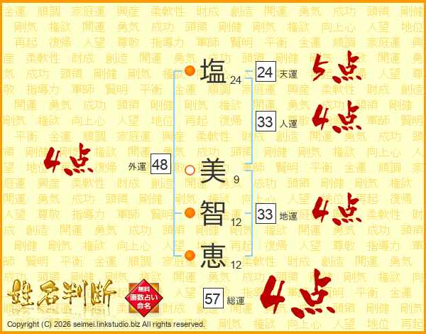 塩(24画) 美(9画)智(12画)恵(12画)