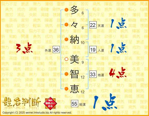 多(6画)々(6画)納(10画) 美(9画)智(12画)恵(12画)