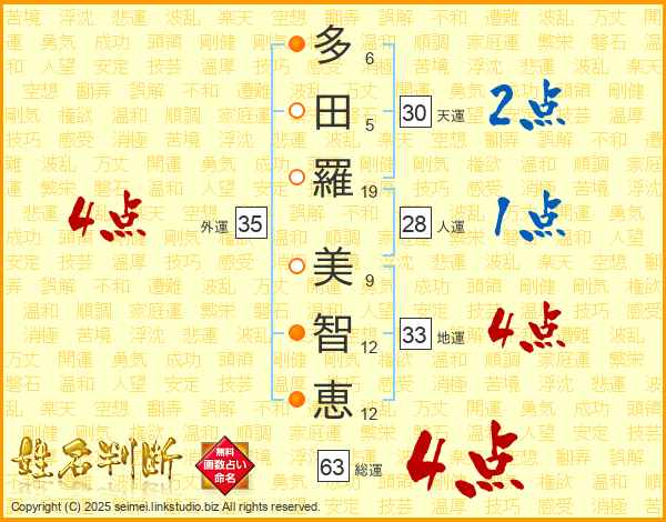 多(6画)田(5画)羅(19画) 美(9画)智(12画)恵(12画)
