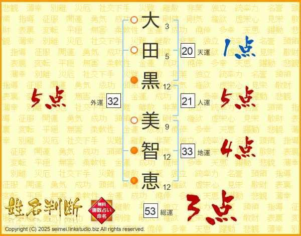 大(3画)田(5画)黒(12画) 美(9画)智(12画)恵(12画)