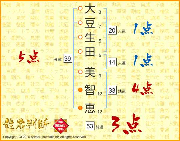 大(3画)豆(7画)生(5画)田(5画) 美(9画)智(12画)恵(12画)