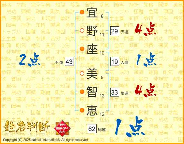 宜(8画)野(11画)座(10画) 美(9画)智(12画)恵(12画)