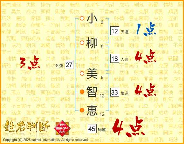 小(3画)柳(9画) 美(9画)智(12画)恵(12画)