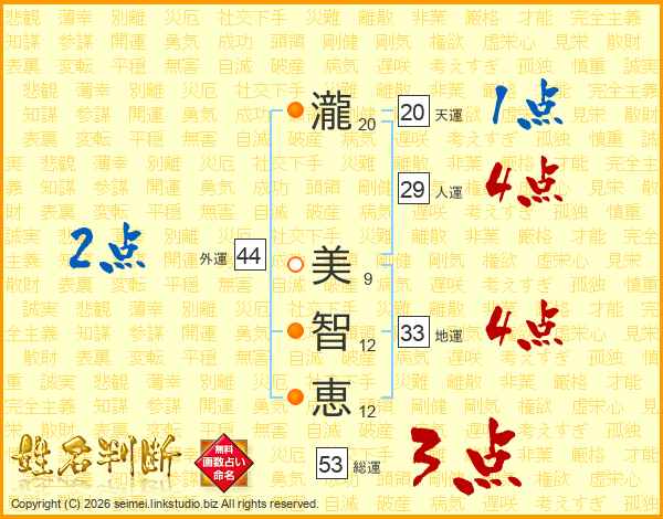 瀧(20画) 美(9画)智(12画)恵(12画)