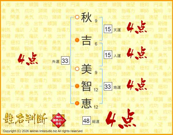 秋(9画)吉(6画) 美(9画)智(12画)恵(12画)