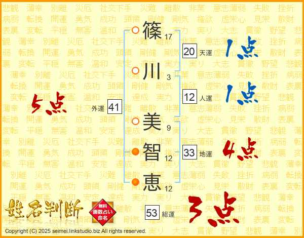 篠(17画)川(3画) 美(9画)智(12画)恵(12画)