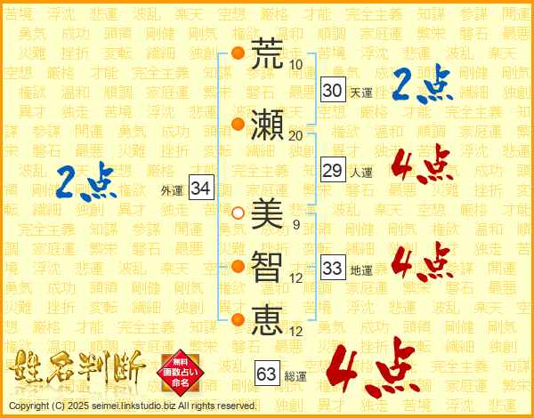 荒(10画)瀬(20画) 美(9画)智(12画)恵(12画)