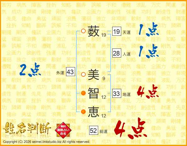 薮(19画) 美(9画)智(12画)恵(12画)