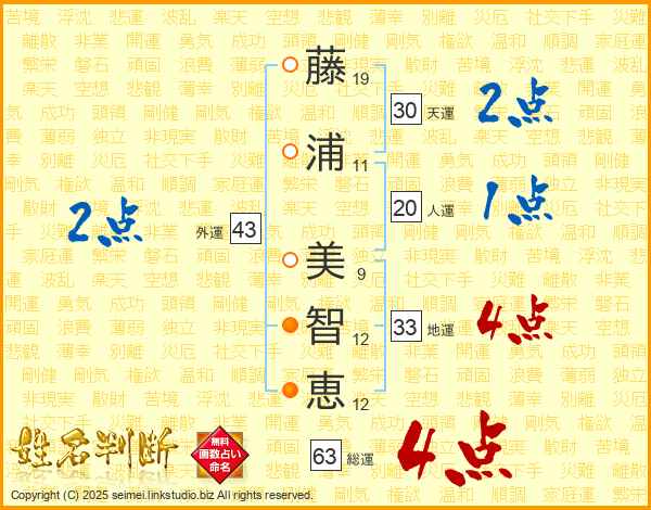 藤(19画)浦(11画) 美(9画)智(12画)恵(12画)