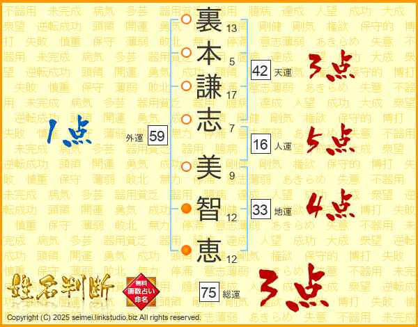 裏(13画)本(5画)謙(17画)志(7画) 美(9画)智(12画)恵(12画)