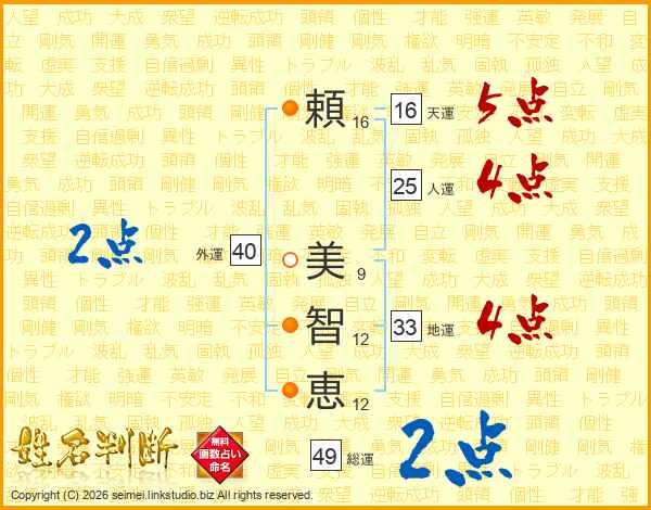 頼(16画) 美(9画)智(12画)恵(12画)