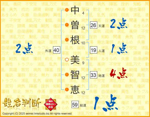 中(4画)曽(12画)根(10画) 美(9画)智(12画)恵(12画)