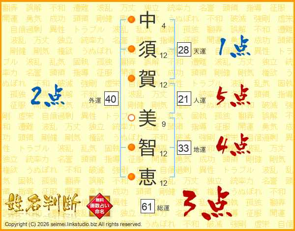 中(4画)須(12画)賀(12画) 美(9画)智(12画)恵(12画)