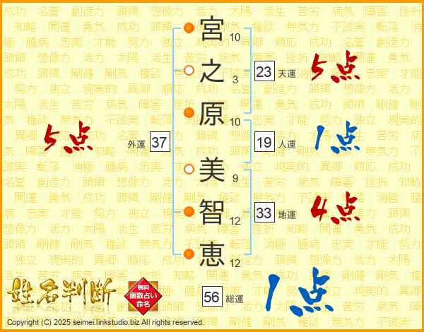 宮(10画)之(3画)原(10画) 美(9画)智(12画)恵(12画)