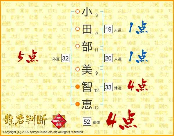 小(3画)田(5画)部(11画) 美(9画)智(12画)恵(12画)