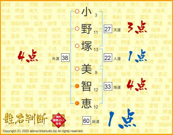 小(3画)野(11画)塚(13画) 美(9画)智(12画)恵(12画)