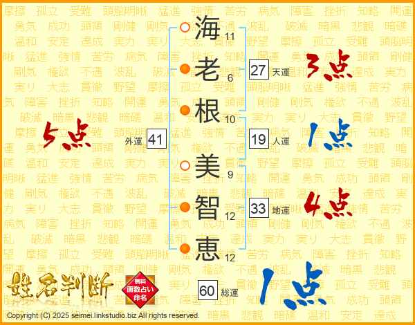 海(11画)老(6画)根(10画)  美(9画)智(12画)恵(12画)