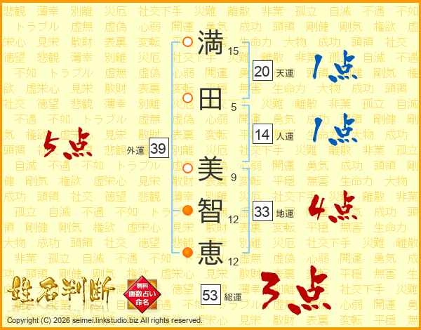 満(15画)田(5画) 美(9画)智(12画)恵(12画)