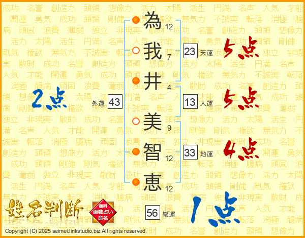 為我井美智恵さんの天運は23画の5点!