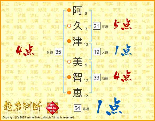阿(8画)久(3画)津(10画) 美(9画)智(12画)恵(12画)