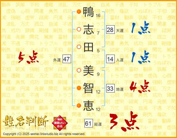 鴨(16画)志(7画)田(5画) 美(9画)智(12画)恵(12画)