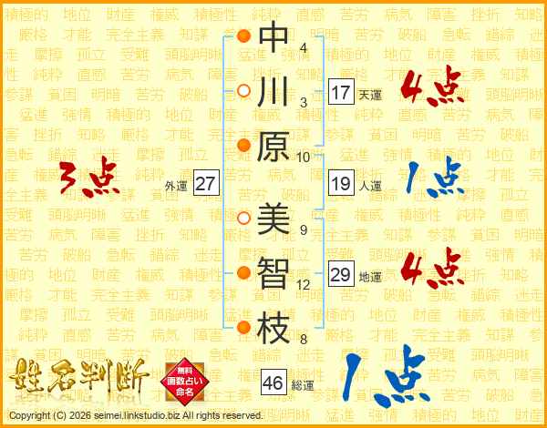 中(4画)川(3画)原(10画) 美(9画)智(12画)枝(8画)
