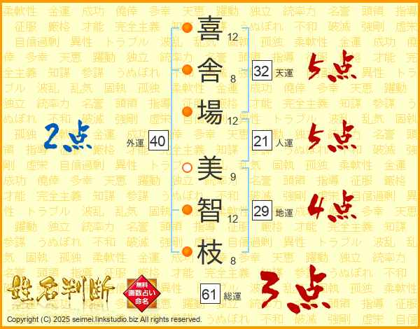 喜(12画)舎(8画)場(12画) 美(9画)智(12画)枝(8画)