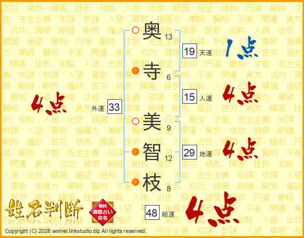 奥(13画)寺(6画) 美(9画)智(12画)枝(8画)