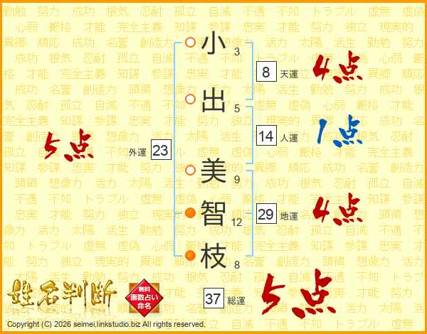 小(3画)出(5画) 美(9画)智(12画)枝(8画)