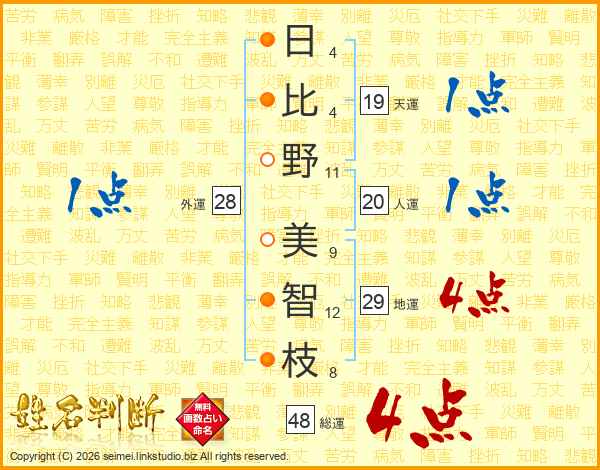 日(4画)比(4画)野(11画) 美(9画)智(12画)枝(8画)