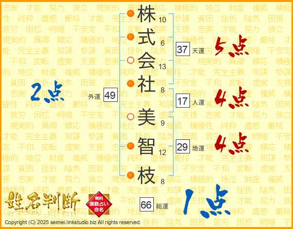 株(10画)式(6画)会(13画)社(8画) 美(9画)智(12画)枝(8画)