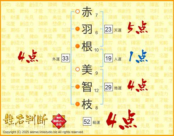 赤(7画)羽(6画)根(10画) 美(9画)智(12画)枝(8画)
