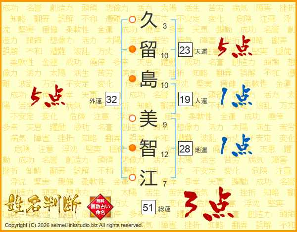 久(3画)留(10画)島(10画) 美(9画)智(12画)江(7画)