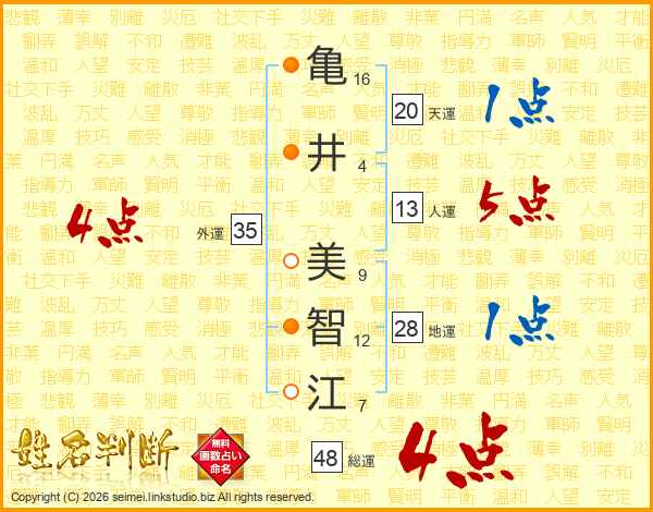亀(16画)井(4画) 美(9画)智(12画)江(7画)