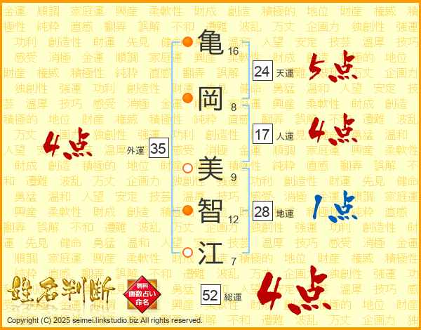 亀(16画)岡(8画) 美(9画)智(12画)江(7画)