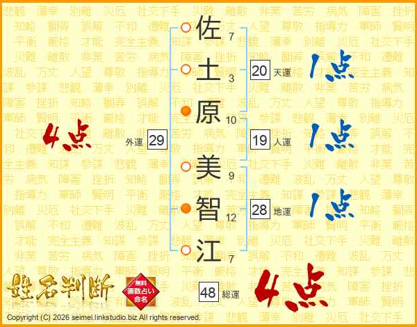 佐(7画)土(3画)原(10画) 美(9画)智(12画)江(7画)