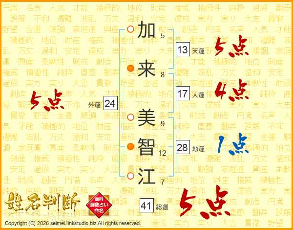 加(5画)来(8画) 美(9画)智(12画)江(7画)
