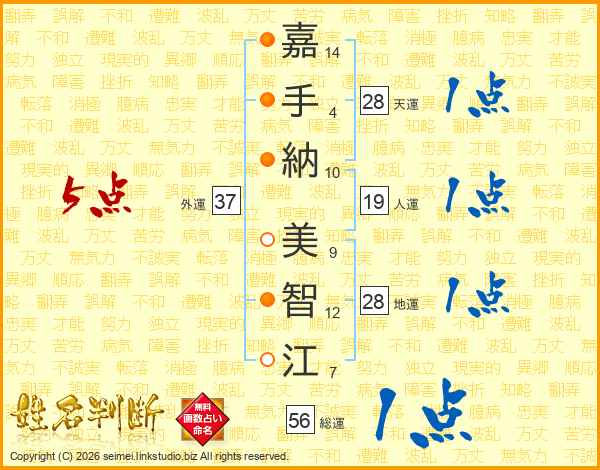 嘉(14画)手(4画)納(10画) 美(9画)智(12画)江(7画)