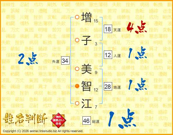 増(15画)子(3画) 美(9画)智(12画)江(7画)