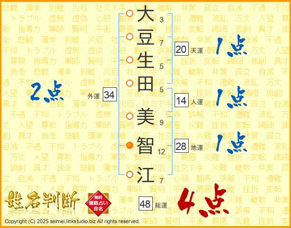 大(3画)豆(7画)生(5画)田(5画) 美(9画)智(12画)江(7画)