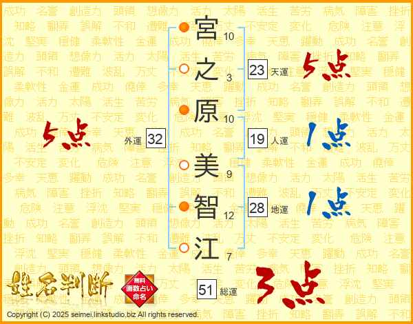 宮(10画)之(3画)原(10画) 美(9画)智(12画)江(7画)