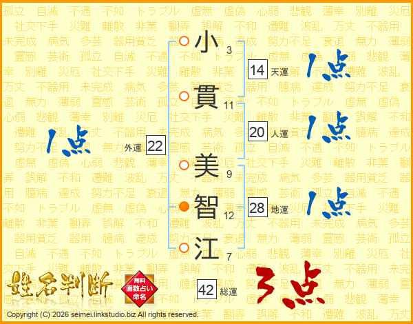 小(3画)貫(11画) 美(9画)智(12画)江(7画)